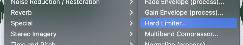 - This is a perfect job for the Hard Limiter tool under the effects menu … Effects > Amplitude and Compression > Hard Limiter …