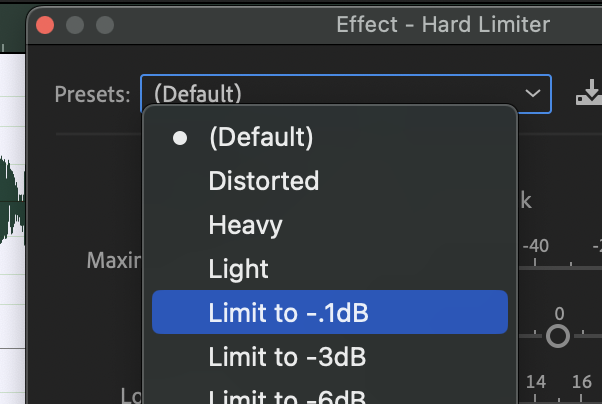 - Under the presets, select “Limit to -.1dB”. This will increase the volume by 6dB (or whatever you set the “Boost Input By” at), but not allow anything to go over -0.1dB, essentially not allowing the file to clip.